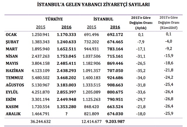 2016 yılında gelen ziyaretçi sayısı da yüzde 25.9 oranında geriledi. Geçtiğimiz yıl 12 milyon 414 bin olan turist sayısı, bu yılın aynı döneminde 9 milyon 203 bin olarak gerçekleşti. İstanbul'un 2016 yılındaki toplam turist kaybı 3 milyon 210 bin oldu.